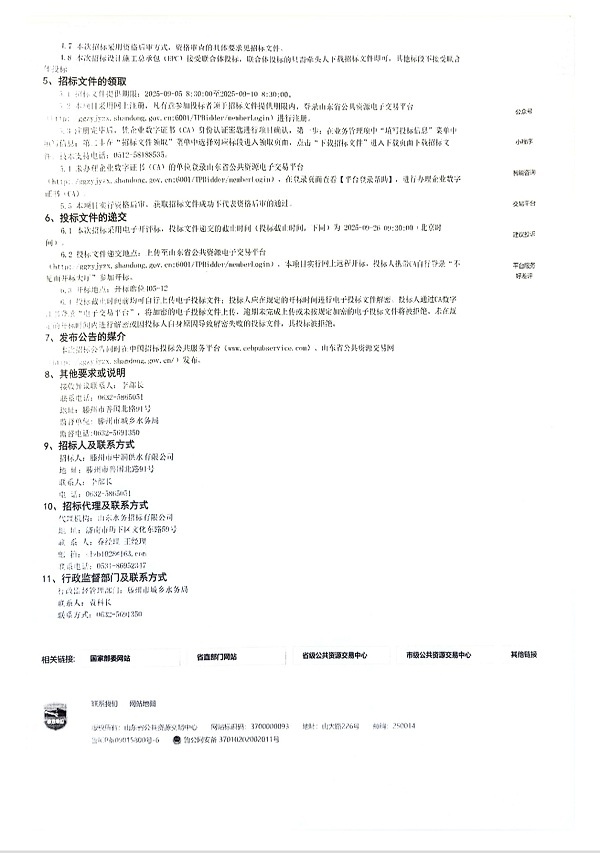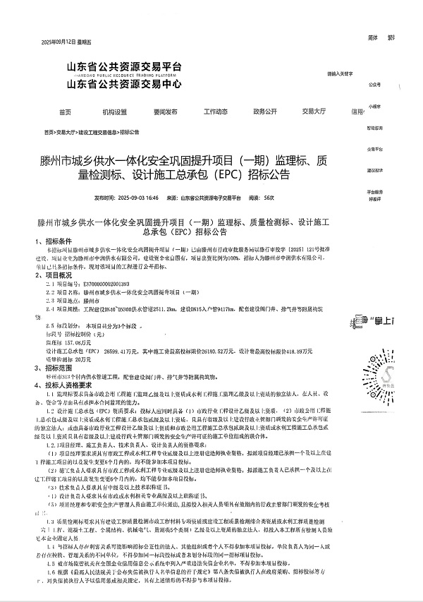 滕州市城乡供水一体化安全巩固提升项目(一期)监理标、质量检测标、设计施工总承包(EPC)招标公告