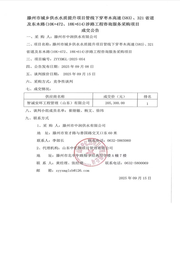 滕州市城乡供水水质提升项目管线下穿枣木高速(S83)、321省道及东木路(10K+472、18K+614)涉路工程咨询服务采购项目成交公告