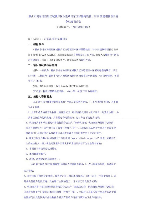 滕州市冯东冯西居区域棚户区改造项目东区球墨铸铁管、TPEP防腐钢管项目竞争性磋商公告