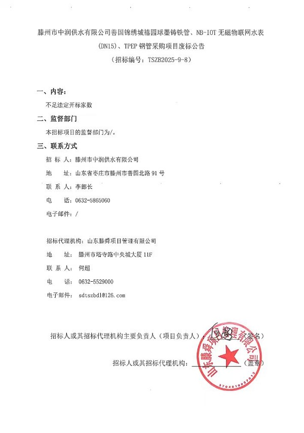 滕州市中润供水有限公司善国锦绣城禧园球墨铸铁管、NB-IOT无磁物联网水表(DN15)、TPEP钢管采购项目废标公告