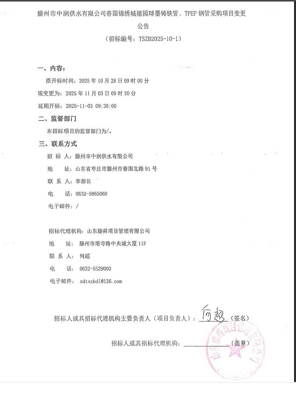 滕州市中润供水有限公司善国锦绣城禧园球墨铸铁管、TPEP钢管采购项目变更公告