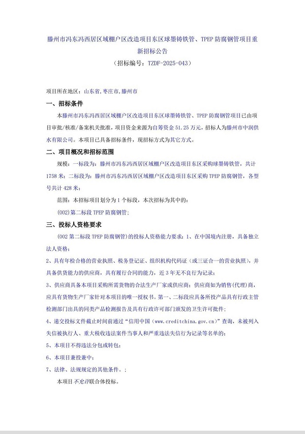 滕州市冯东冯西居区域棚户区改造项目东区球墨铸铁管、TPEP防腐钢管项目重新招标公告
