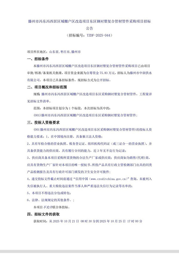 滕州市冯东冯西居区域棚户区改造项目东区钢衬塑复合管材管件采购项目招标公告