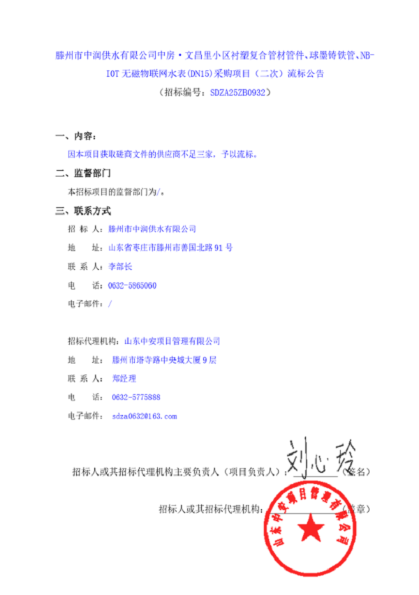 滕州市中润供水有限公司中房·文昌里小区衬塑复合管材管件、球墨铸铁管、NB-IOT 无磁物联网水表(DN15)采购项目(二次)流标公告