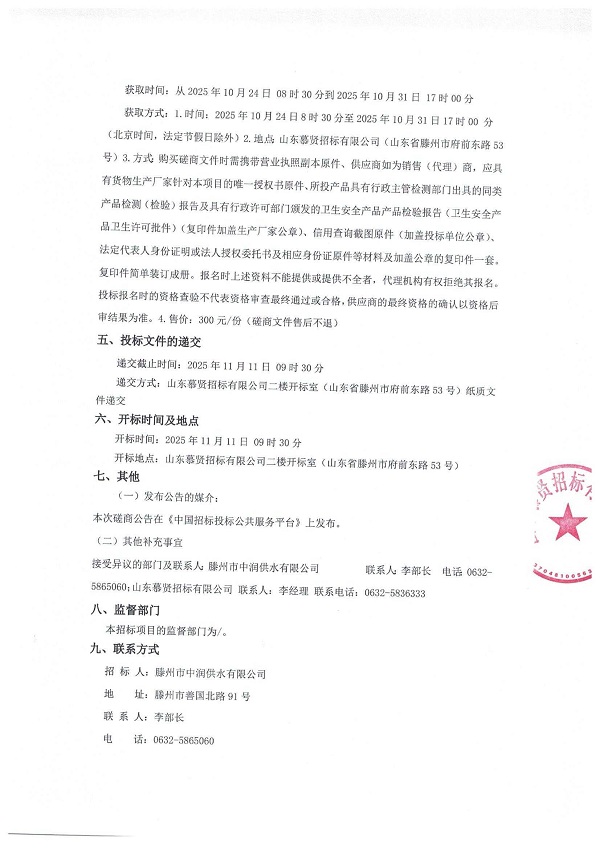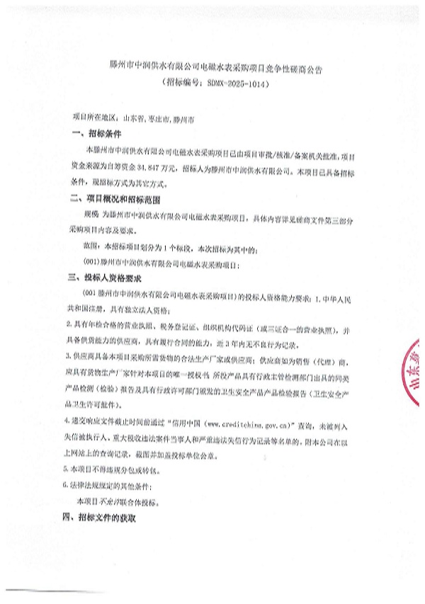 滕州市中润供水有限公司电磁水表采购项目竞争性磋商公告