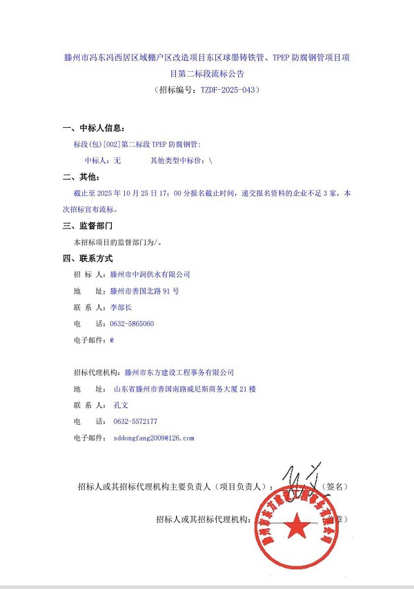 滕州市冯东冯西居区域棚户区改造项目东区球墨铸铁管、TPEP防腐钢管项目项目第二标段流标公告