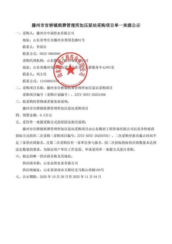滕州市官桥镇殡葬管理所加压泵站采购项目单一来源公示