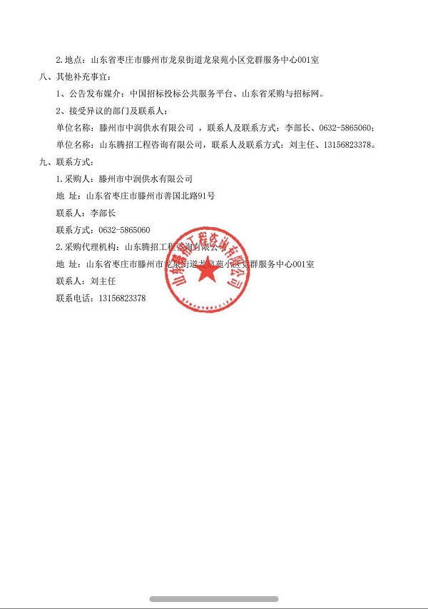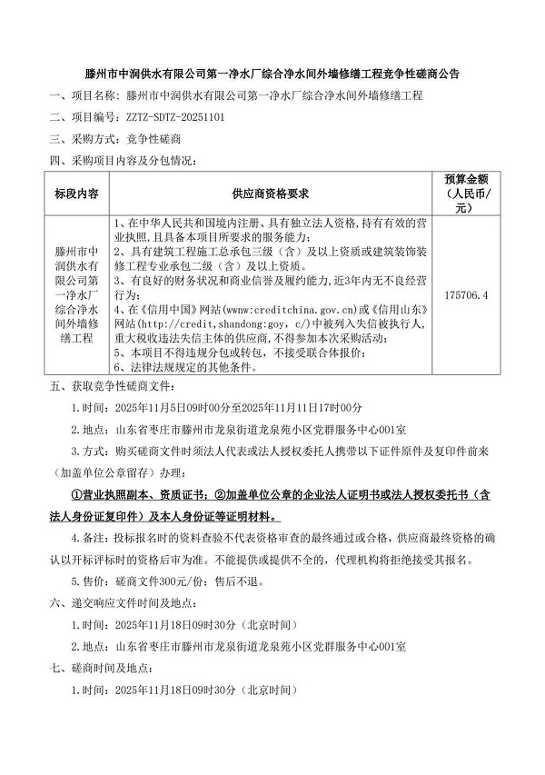 滕州市中润供水有限公司第一净水厂综合净水间外墙修缮工程竞争性磋商公告