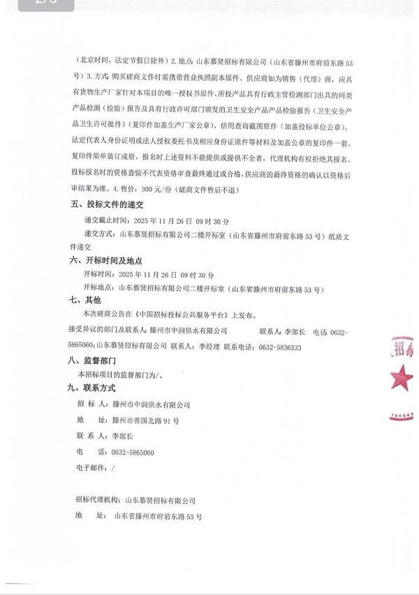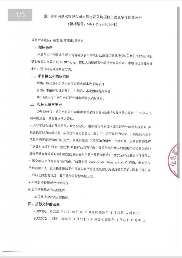 滕州市中润供水有限公司电磁水表采购项目二次竞争性磋商公告