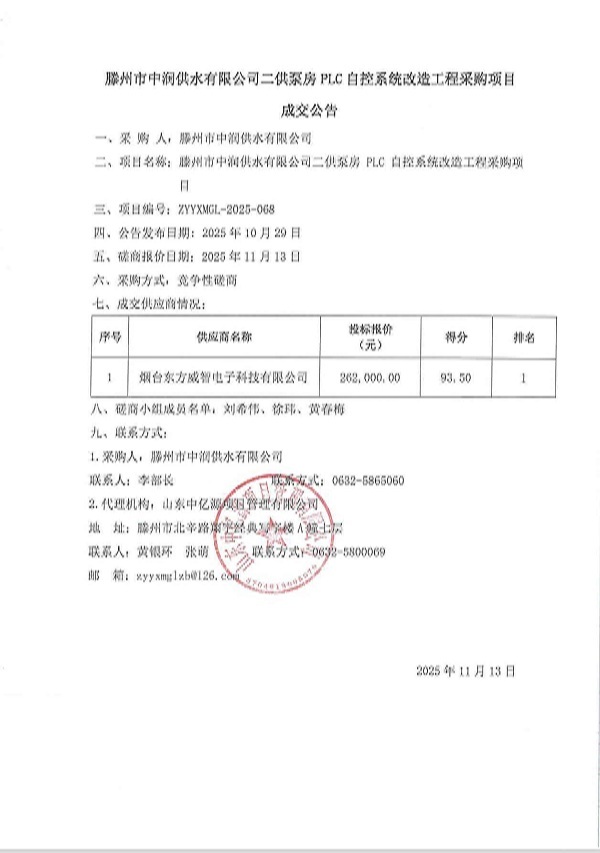 滕州市中润供水有限公司二供泵房PLC自控系统改造工程采购项目成交公告