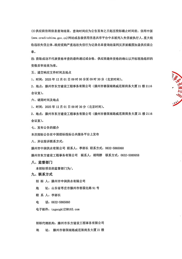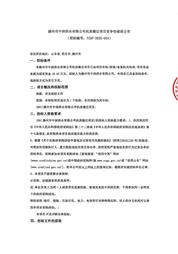 滕州市中润供水有限公司机房搬迁项目竞争性磋商公告