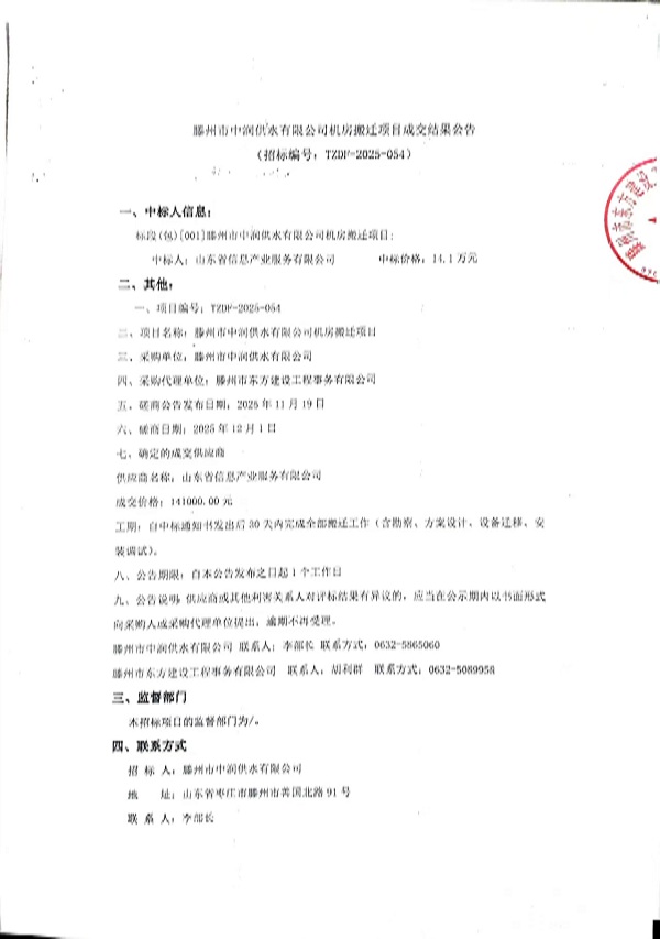 滕州市中润供水有限公司机房搬迁项目成交结果公告