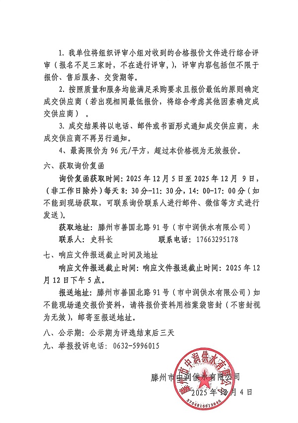 滕州市中润供水有限公司水厂防水工程采购项目询价公告