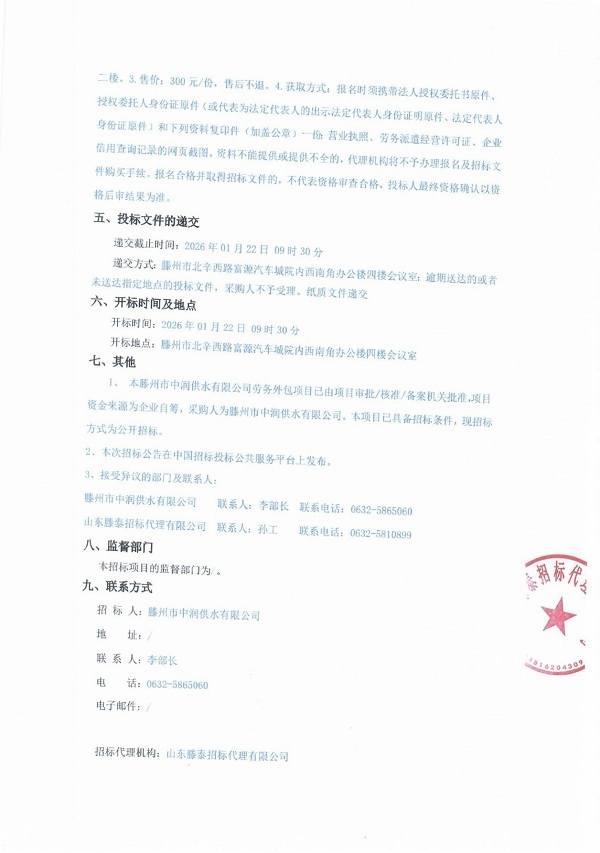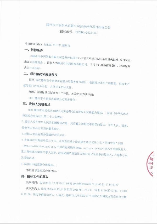 滕州市中润供水有限公司劳务外包项目招标公告