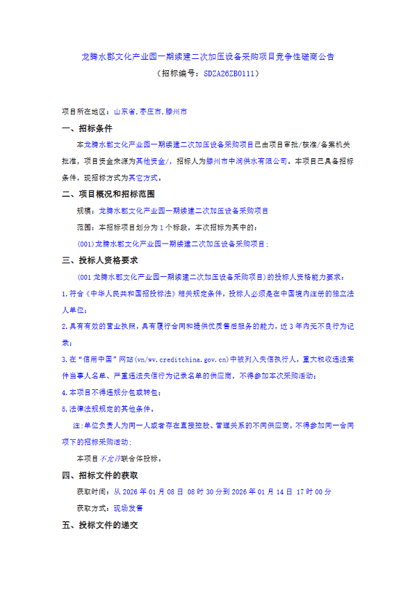 龙腾水郡文化产业园一期续建二次加压设备采购项目竞争性磋商公告