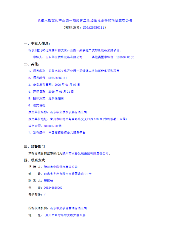龙腾水郡文化产业园一期续建二次加压设备采购项目成交公告