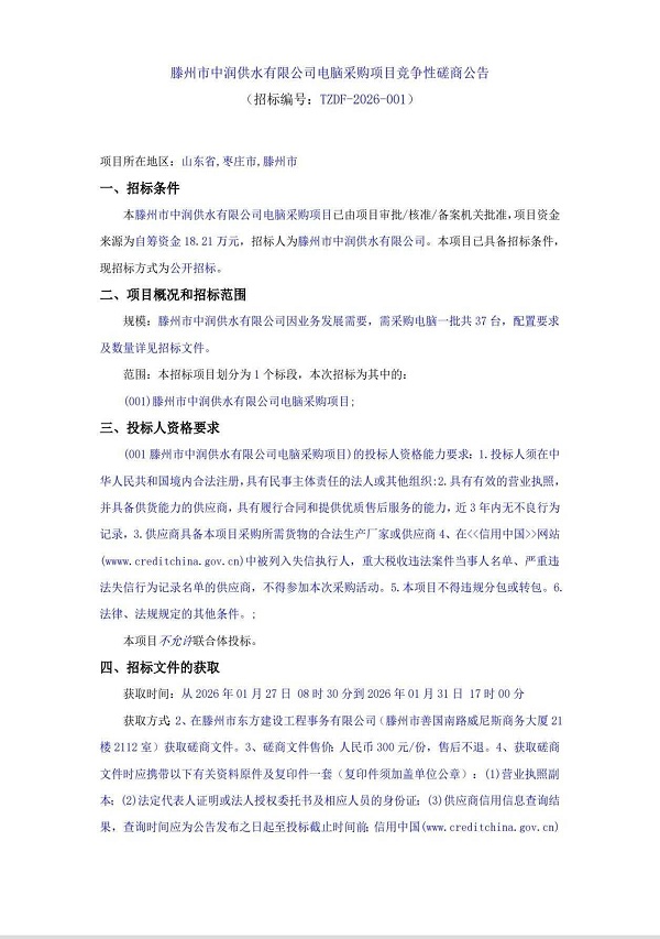 滕州市中润供水有限公司电脑采购项目竞争性磋商公告