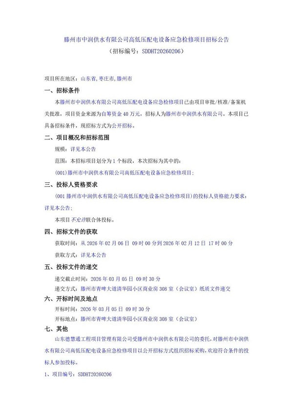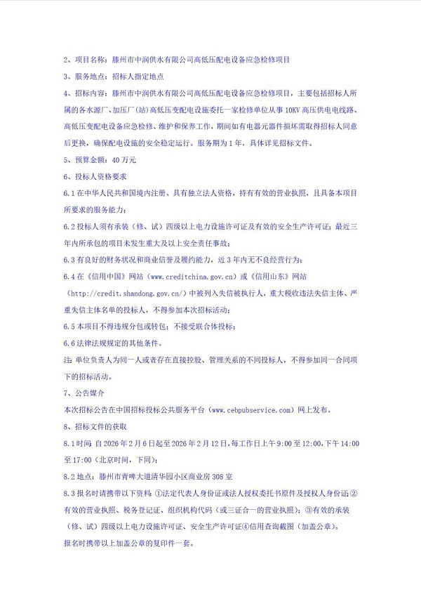 滕州市中润供水有限公司高低压配电设备应急检修项目招标公告
