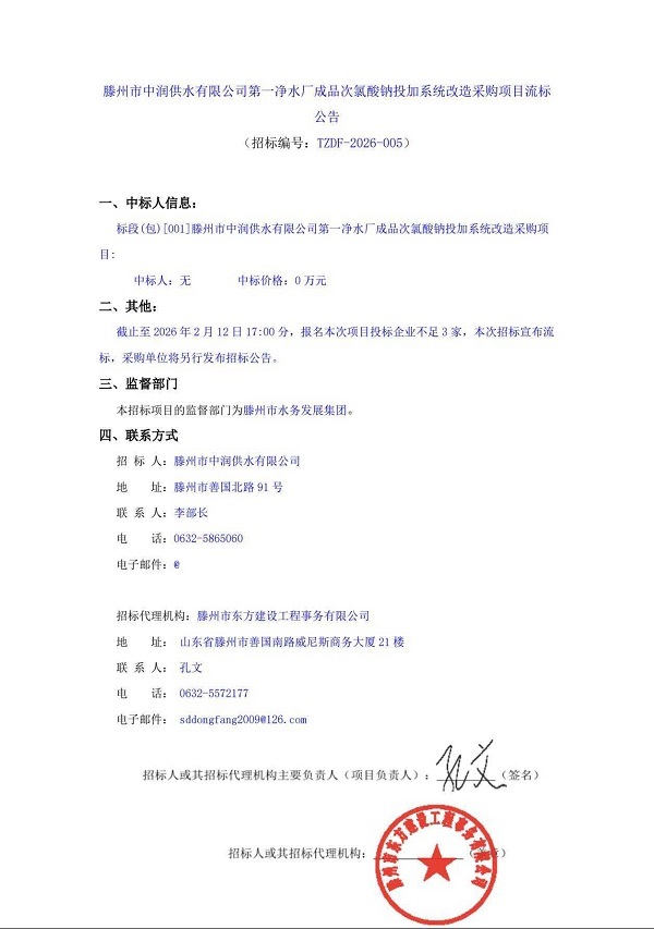 滕州市中润供水有限公司第一净水厂成品次氯酸钠投加系统改造采购项目流标公告