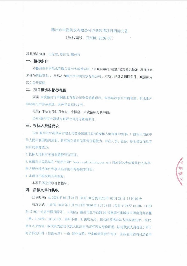 滕州市中润供水有限公司劳务派遣项目招标公告