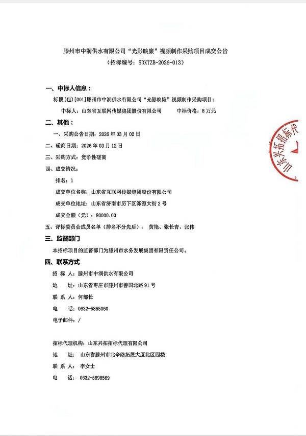 滕州市中润供水有限公司"光影映廉"视频制作采购项目成交公告