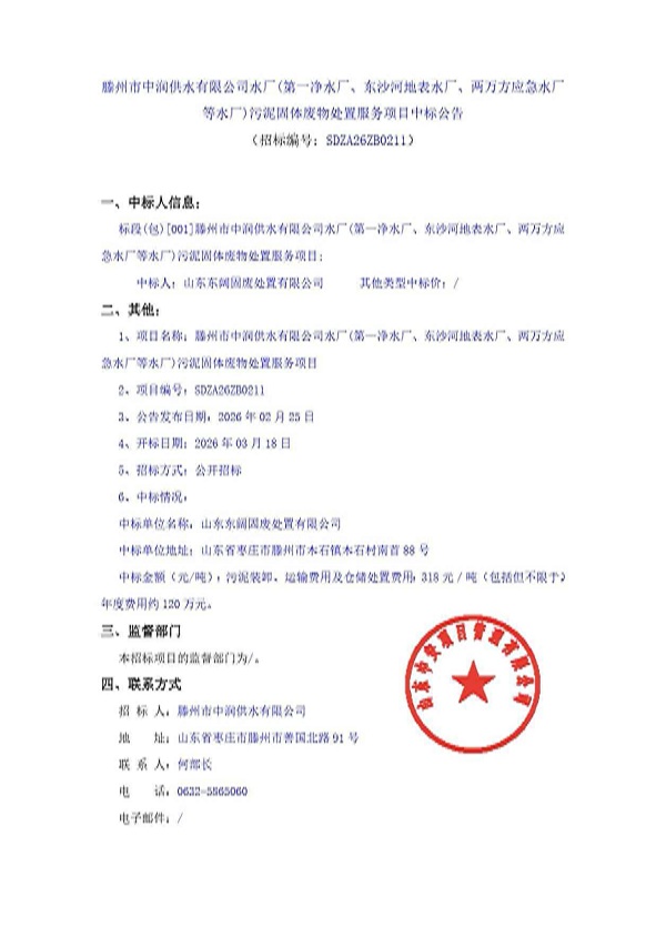 滕州市中润供水有限公司水厂(第一净水厂,东沙河地表水厂,两万方应急水厂等水厂)污泥固体废物处置服务项目中标公告