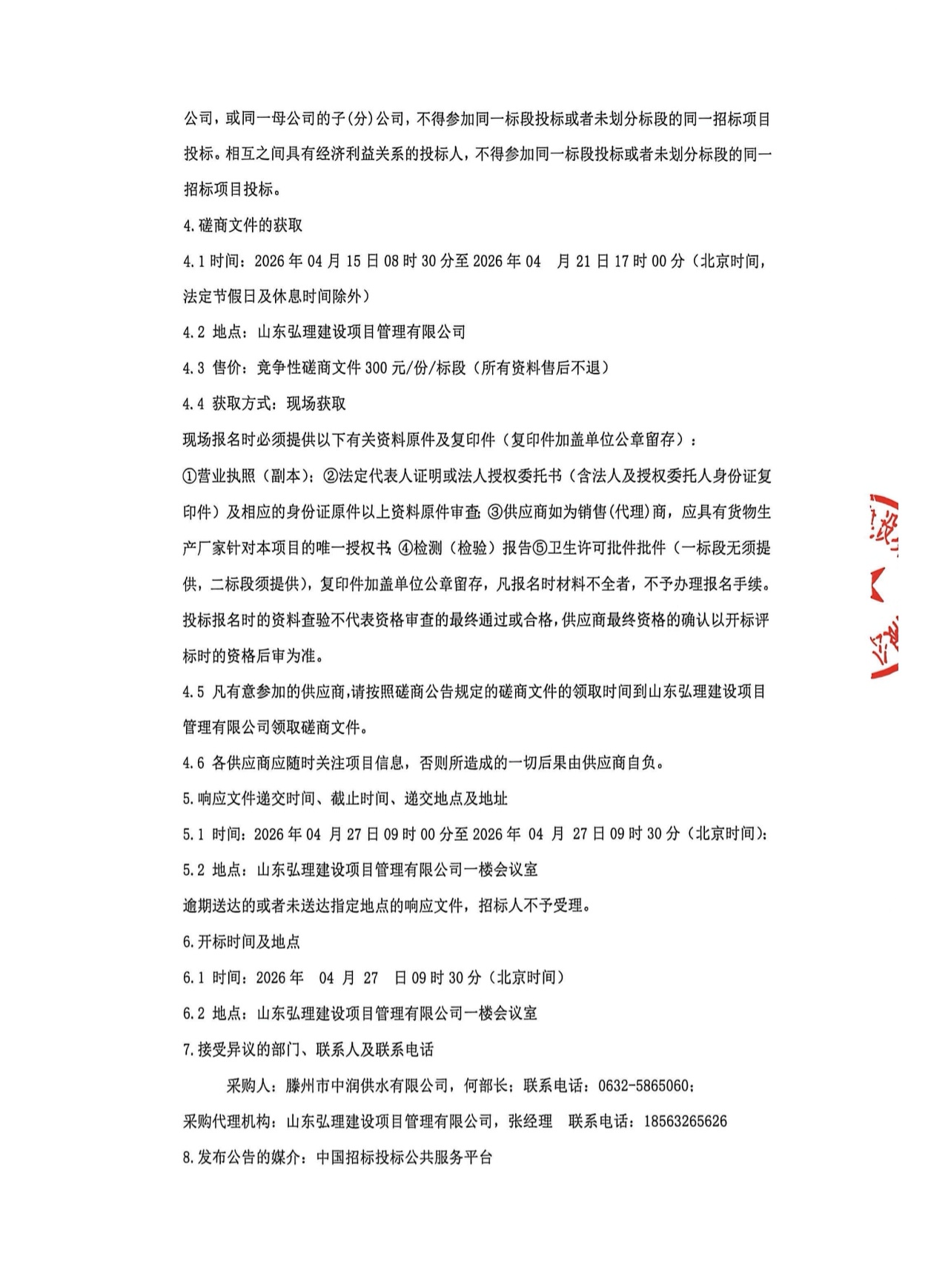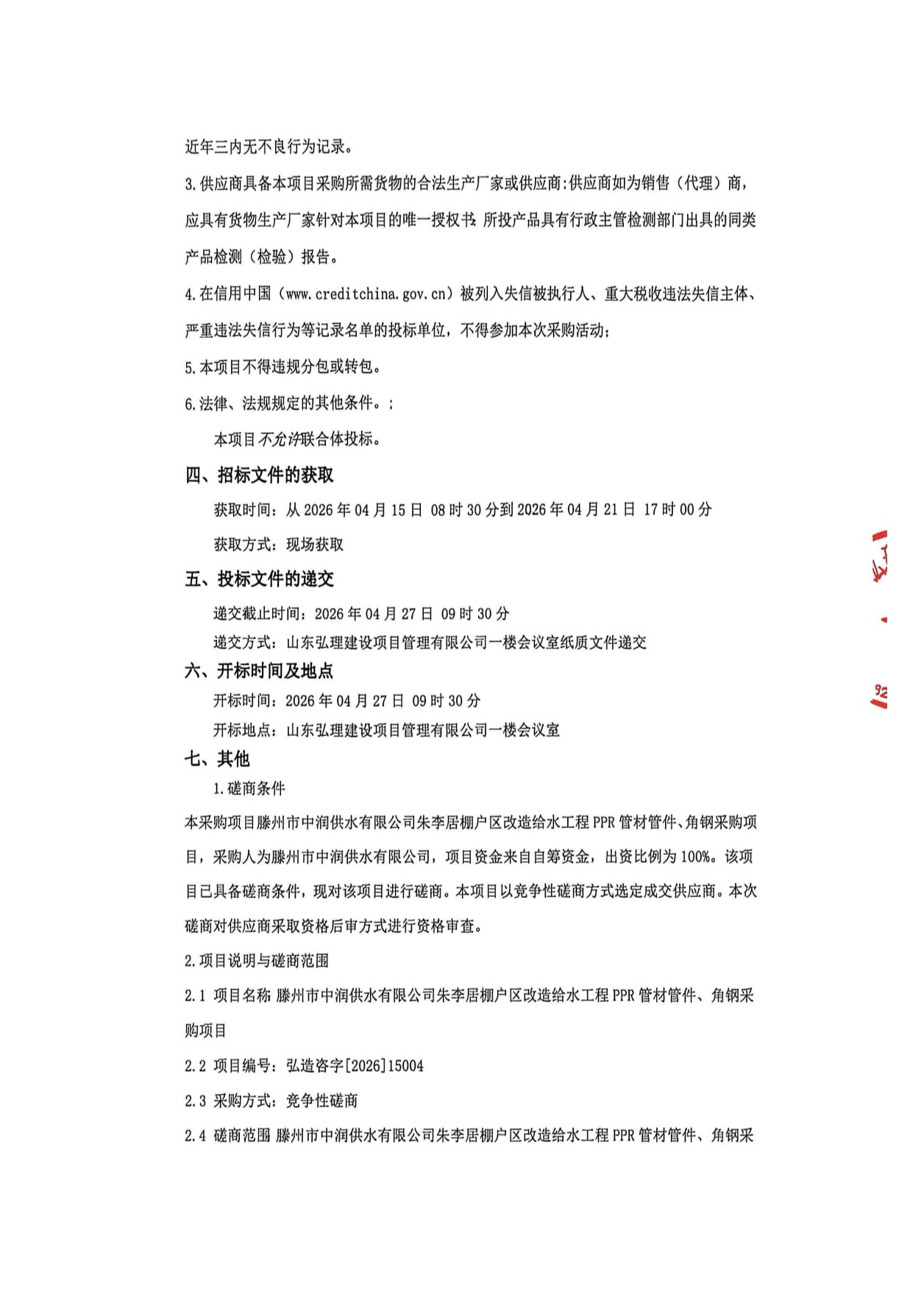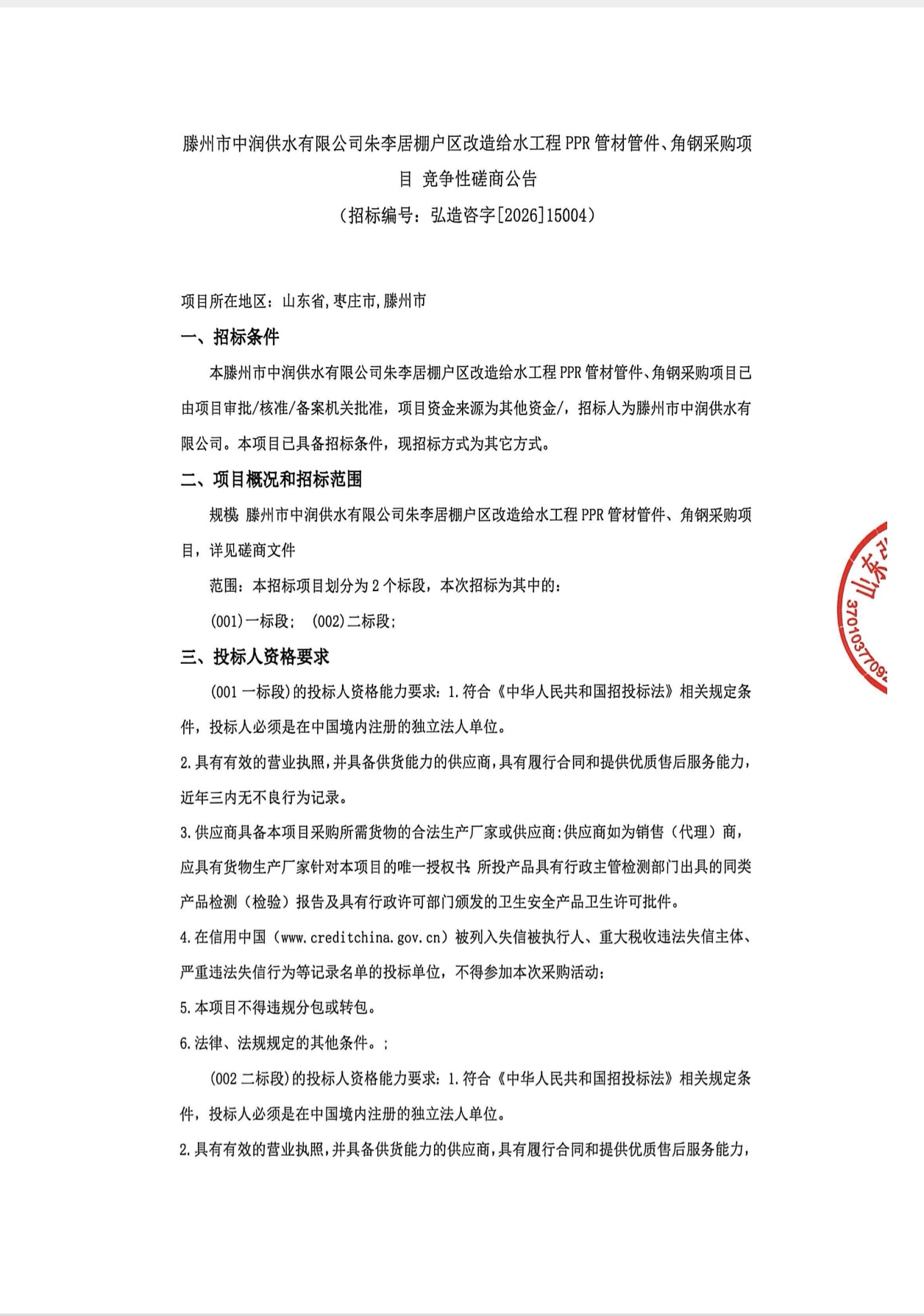 滕州市中润供水有限公司朱李居棚户区改造给水工程 PPR管材管件、角钢采购项目竟争性磋商公告