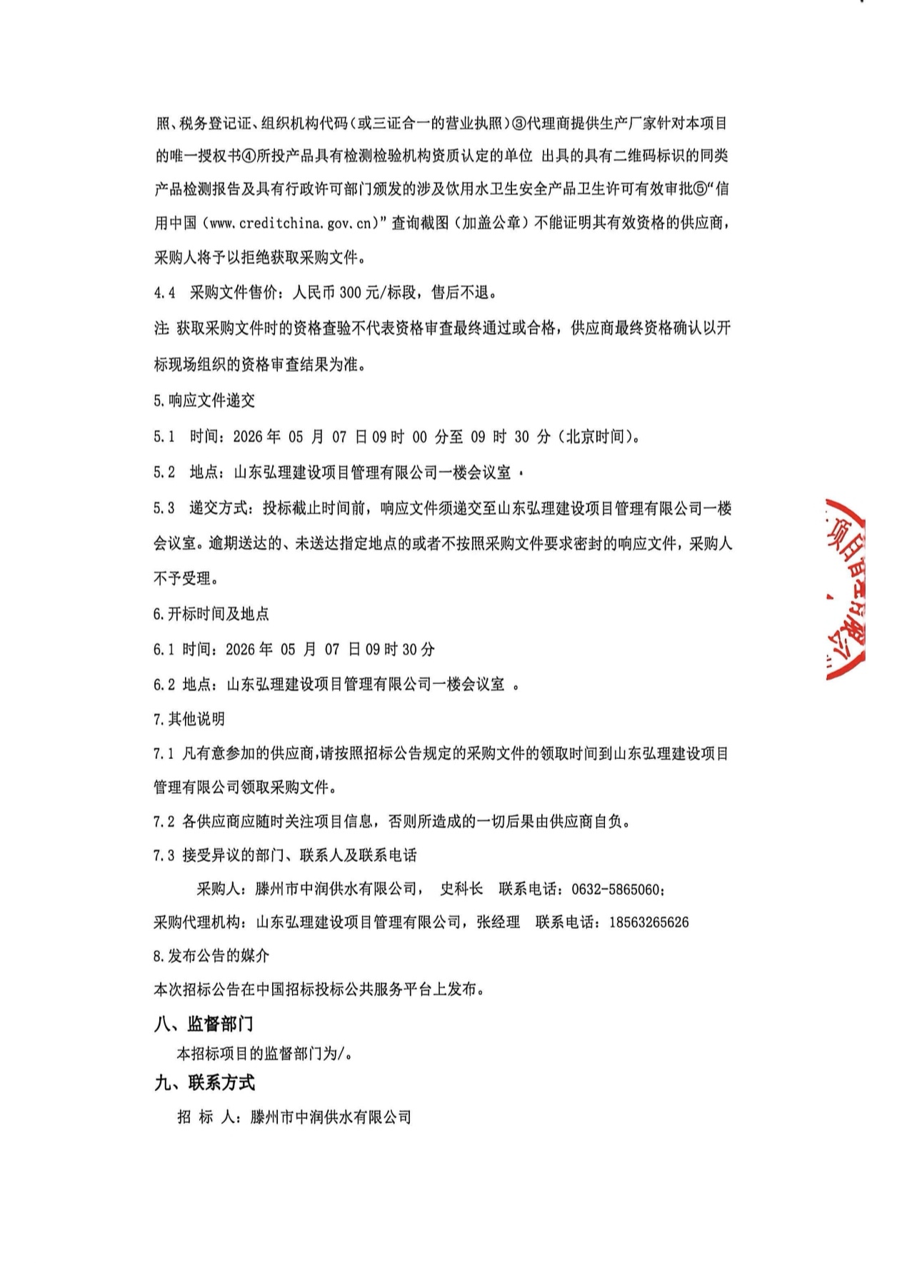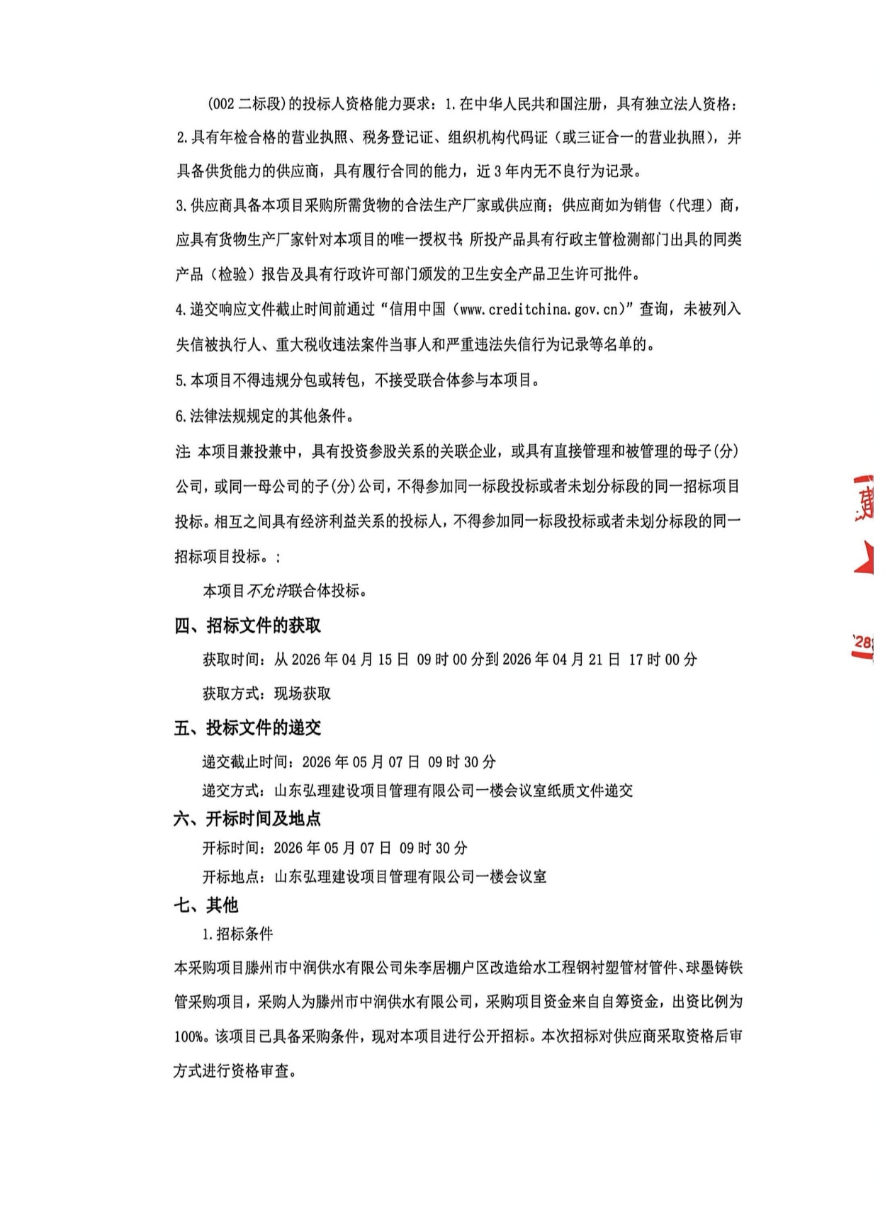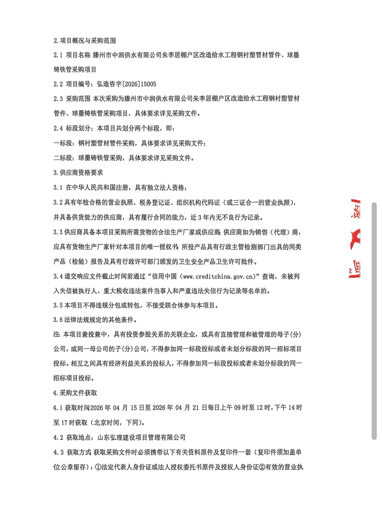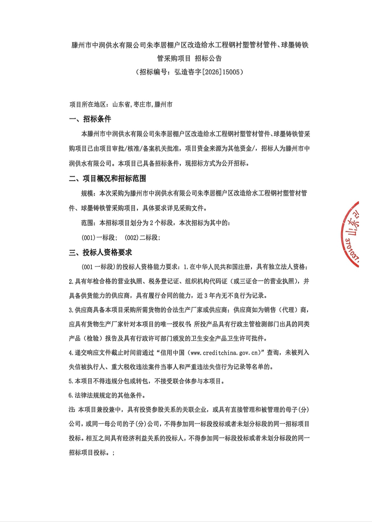 滕州市中润供水有限公司朱李居棚户区改造给水工程钢衬塑管材管件、球墨铸铁管采购项目 招标公告