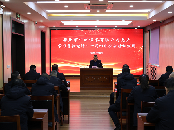 为深入学习贯彻党的二十届四中全会精神,准确把握全会核心要义与实践要求,切实将思想和行动统一到全会精神上来,12月12日,市水务发展集团中润供水有限公司开展学习贯彻党的二十届四中全会精神宣讲活动。公司党委书记、董事长吕传生同志作专题宣讲,公司领导班子、全体中层干部共130人参加。