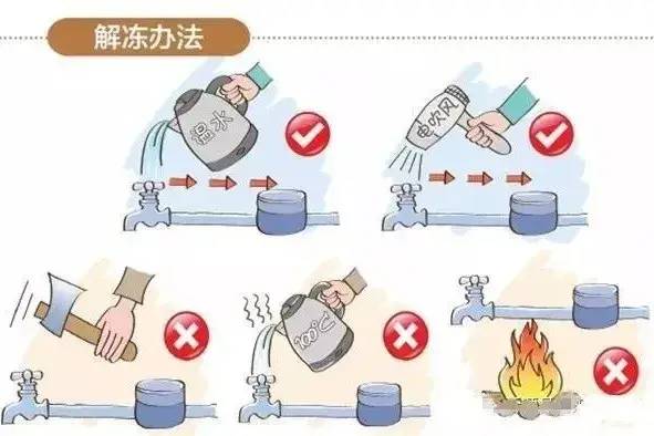 •对确已冰冻的水龙头、水表、水管,宜先用热毛巾包裹着水龙头,然后浇温水,使龙头解冻,再拧开龙头,用温水沿着龙头慢慢向管子浇洒,使水管解冻(如果是塑料的PP-R和PVC管,用户也可用电吹风烘吹)。切忌用火烘烤或用开水直接冲淋,以免造成管道或者水表破裂;